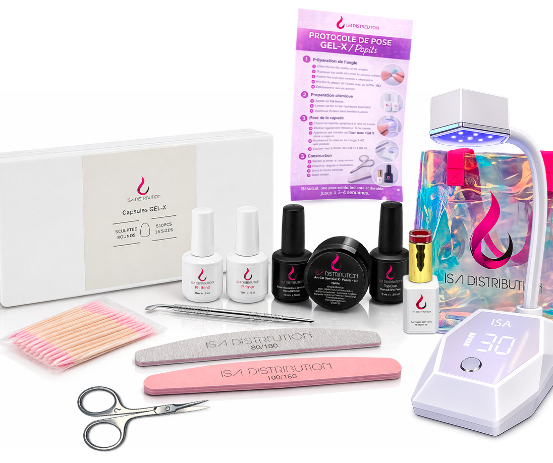 Obtenez une pose professionnelle rapide , solide et élégante avec le kit expert gel x ISA DISTRIBUTION Conçu pour les prothésistes angulaires et passionnées exigeantes , ce kit complet contient tout le nécessaire pour réaliser des extensions d’ongles parfaites avec la technique Gel-x